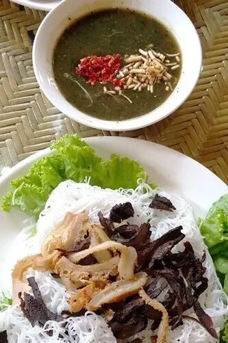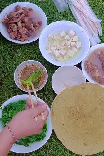 大热天里到滇西的傣家赶摆,酷热难耐六神无主时,最招人爱的,还是这傣家特有的“撒撇”,一盘白白的细米线上顶着几片刀功不赖的牛杂凉片,旁边一大碗用心认真切的细碎的生韭菜缅甸芫荽姜蒜汁小米辣柠檬汁加上汆熟的猪肉麽调制出的蘸水,红绿相间透着让人口水横流的香味,手脚麻利把米线调进蘸水碗里,迫不及待送入口里,柠檬的酸小米辣的劲生韭菜芫荽的香汆肉麽的甜逐一在嘴里铺开,柔软洁白的米线只成了配角,痛快吃下肚,六神具安!!