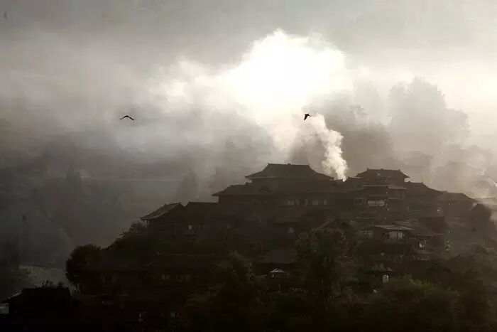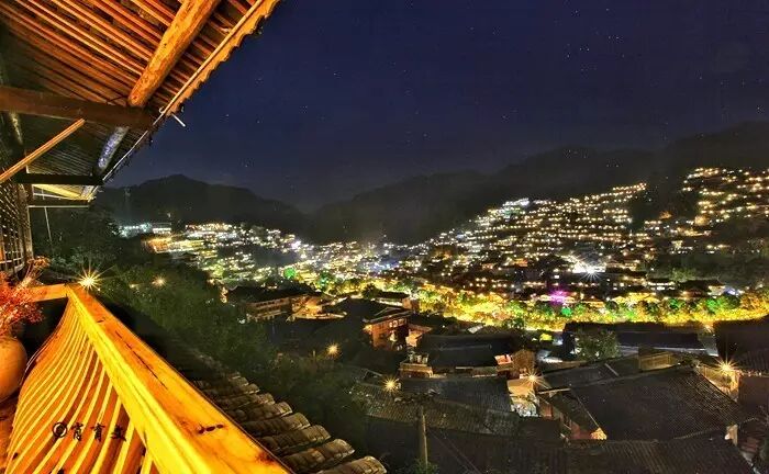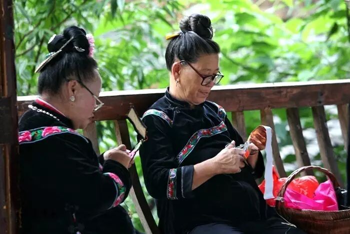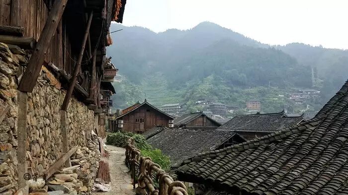 寨子里,二楼朝路的一面往往会有一段外突的靠栏,当地人叫它作“美人靠”———家中的女子闲暇时可以舒服地倚坐在美人靠上,绣绣花,聊聊天,吹吹山间清风。