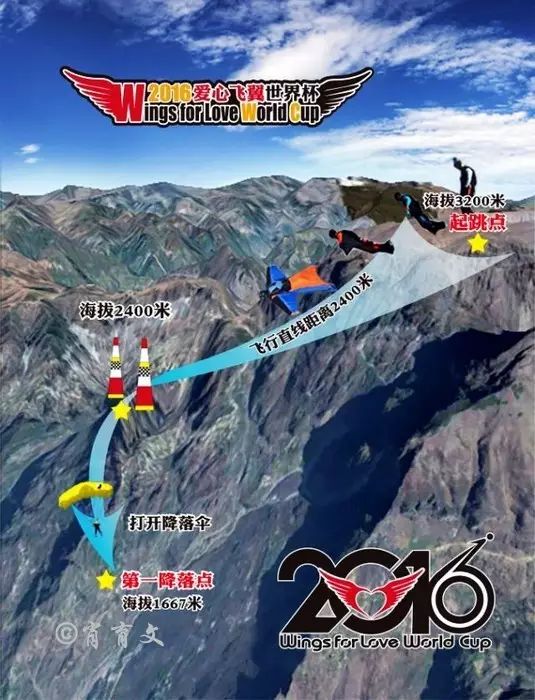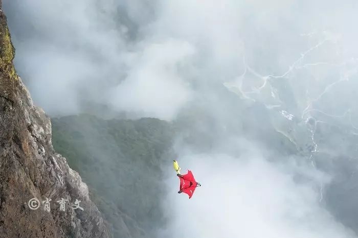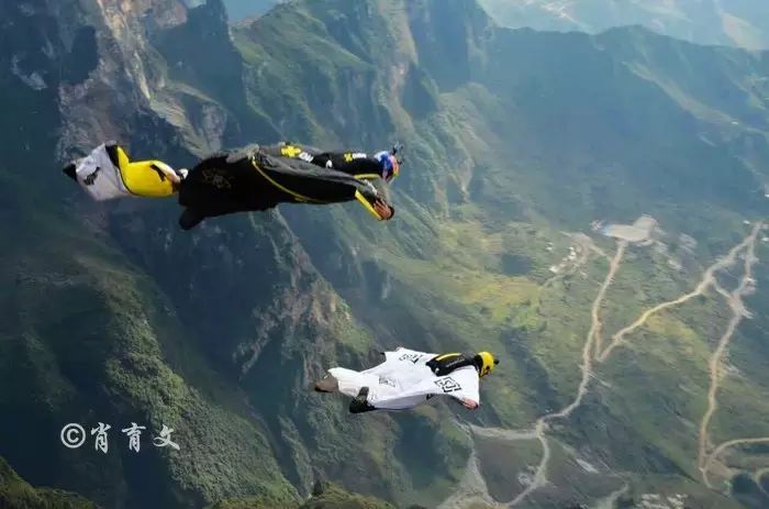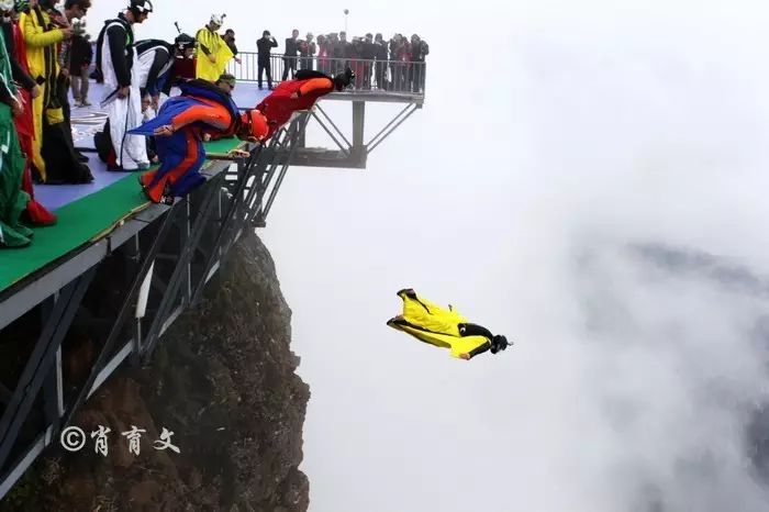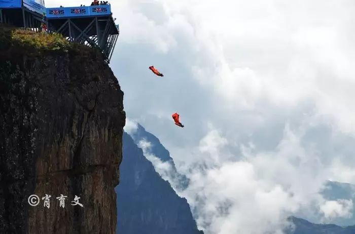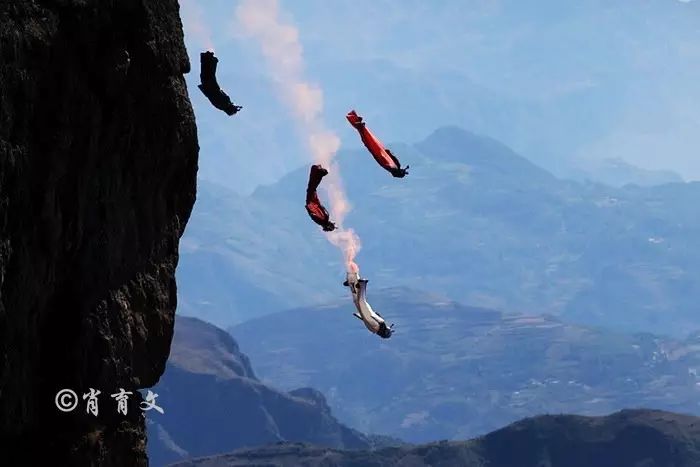 在我们的翘首企盼中,“鸟人”们跃出高耸入云的跳台,以时速每小时220公里的速度向两千多米的峡谷飞去,为了确保飞行成功,他们利用手脚,不断调整和控制方向,朝着大山包的峡谷呼啸而去。