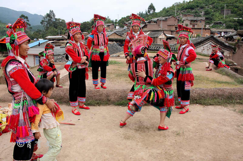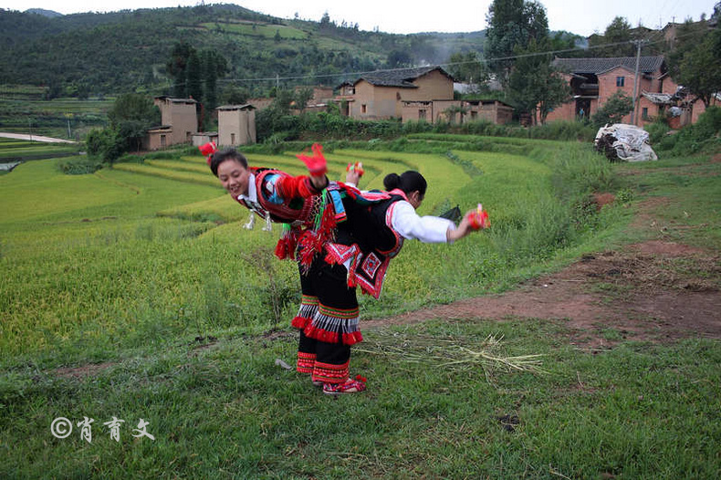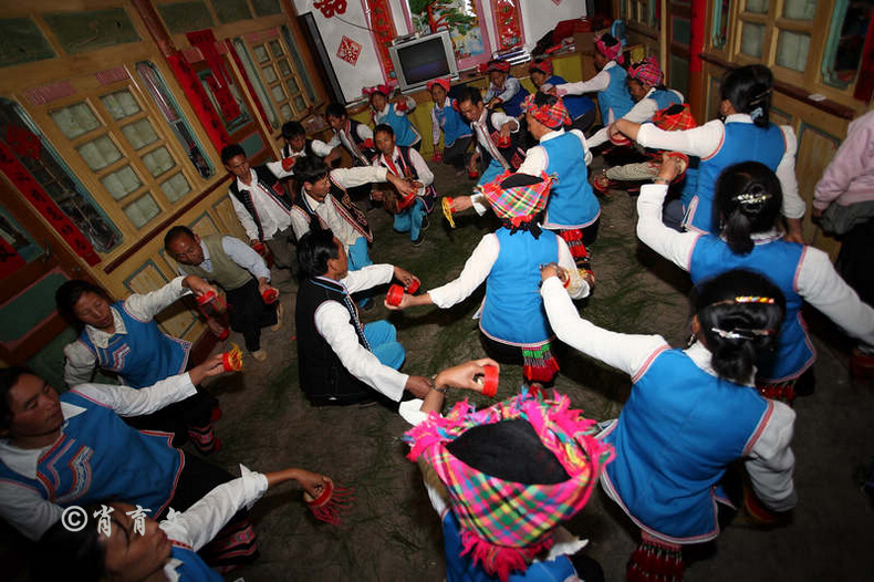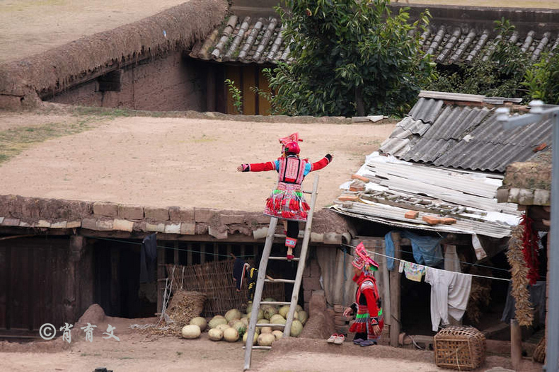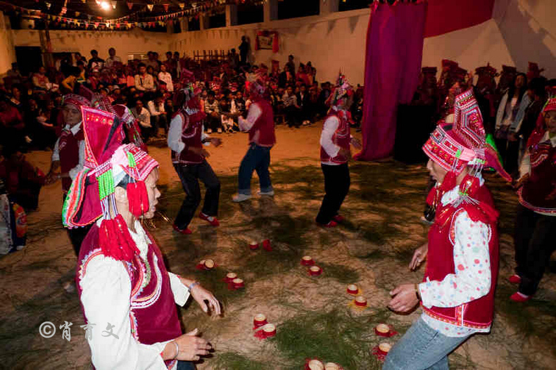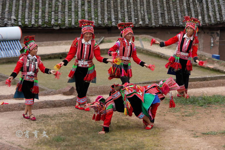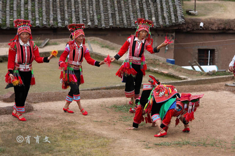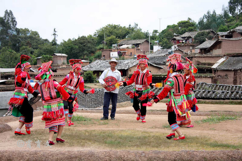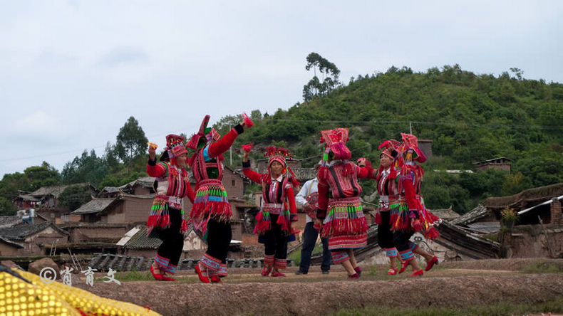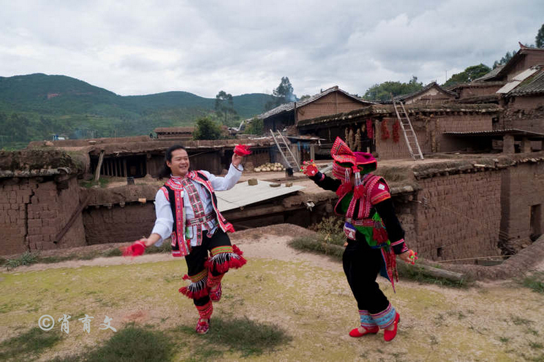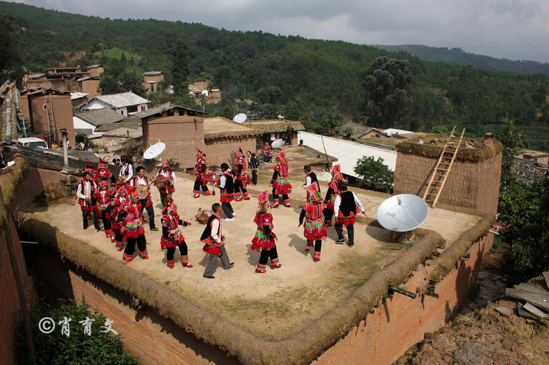 走上屋顶,你会发现这里比屋内热闹多了,那些衣着缤纷艳丽的彝族青年,小伙子和小姑娘,随着手中的木烟盒和四弦跳起了烟盒舞。