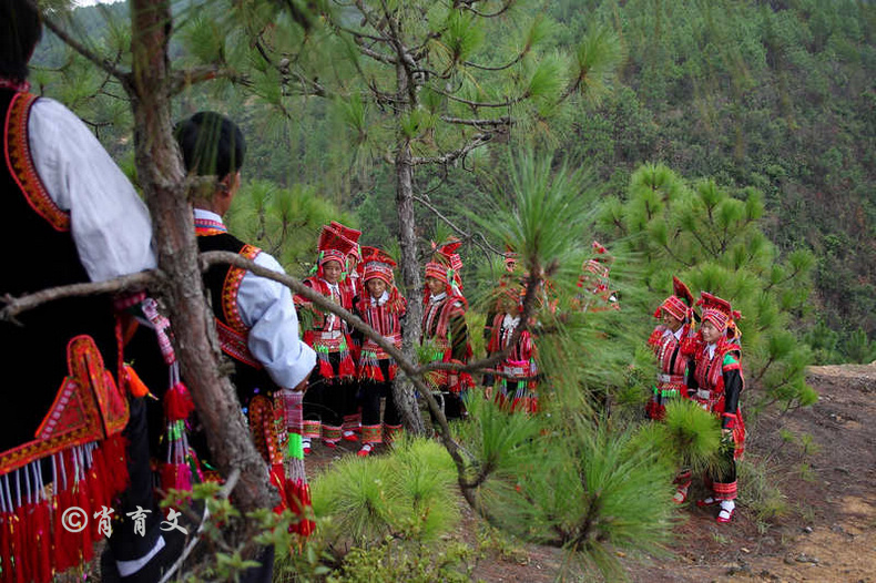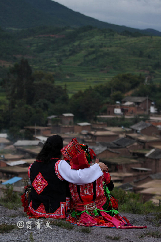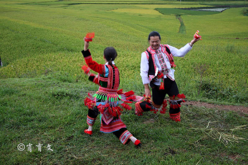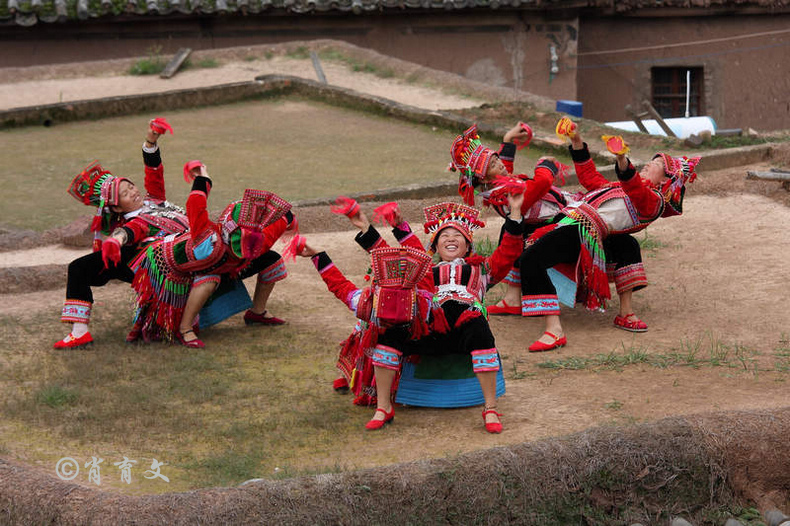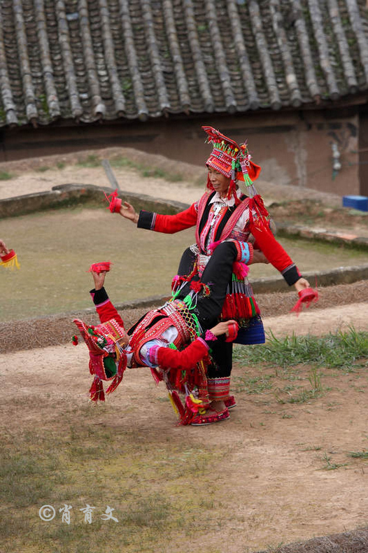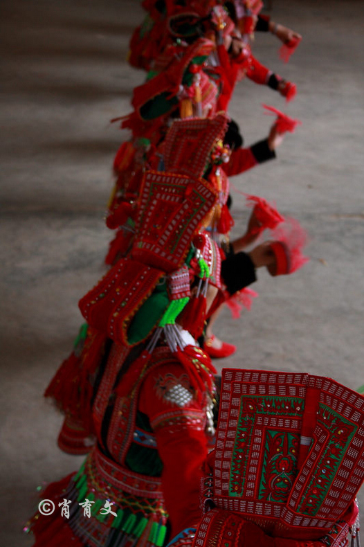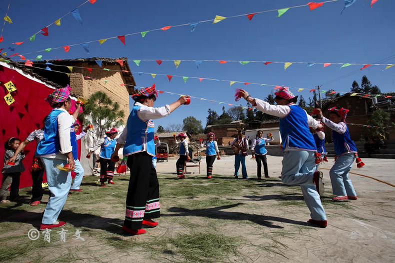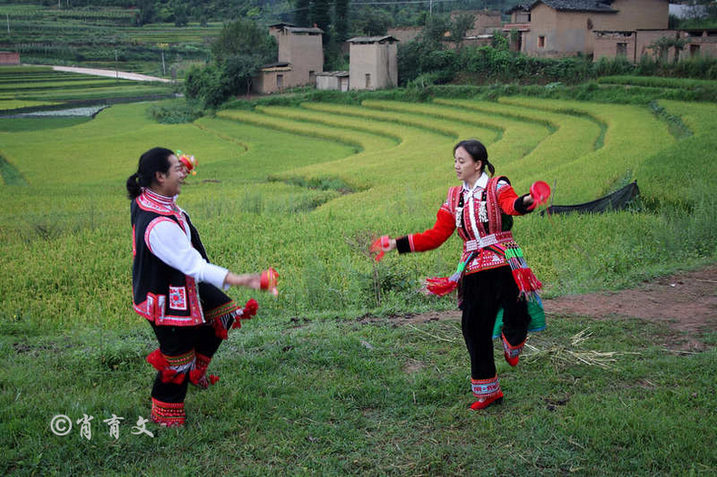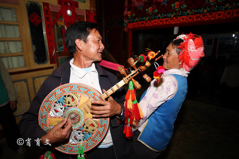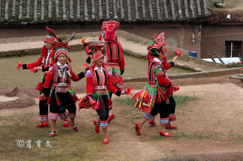 走上屋顶,你会发现这里比屋内热闹多了,那些衣着缤纷艳丽的彝族青年,小伙子和小姑娘,随着手中的木烟盒和四弦跳起了烟盒舞。