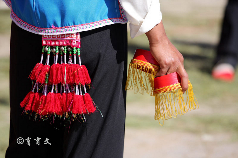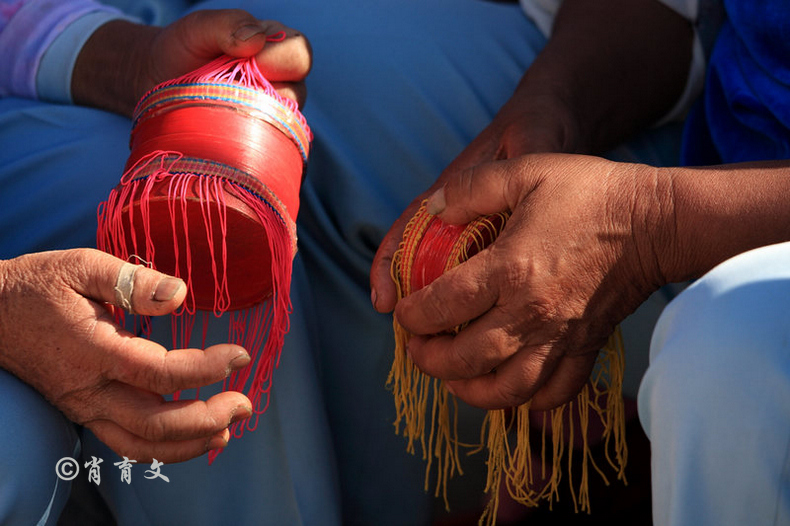 作为道具的烟盒,是彝族汉子抽竹水烟筒装烤烟丝的烟盒脱胎而来。在底部缀上各色丝绒装饰物,便成为一个完整的烟盒道具了。