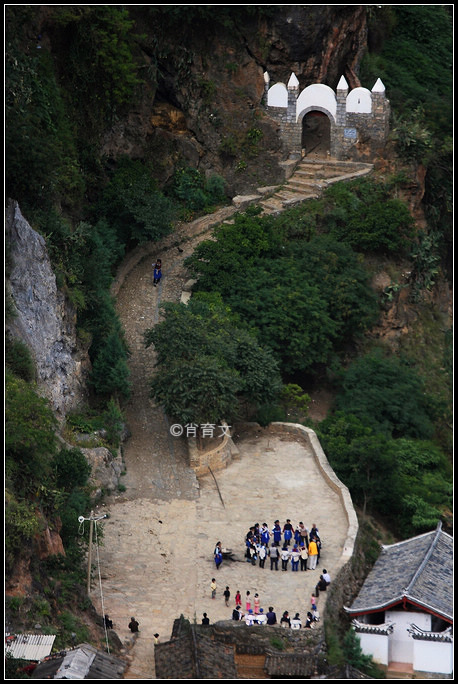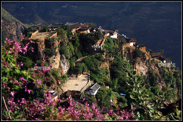 作为城址的这块巨岩,三面都是绝壁深谷,东面临江如刀削,惟有南面一条羊肠险道外通,所以没有高峻的城墙,只是为了加固防守,围砌了一圈1米高的石墙作掩体。城内瓦屋鳞比,巷道纵横,现有住户108家,城外有住户137家,全为纳西族。