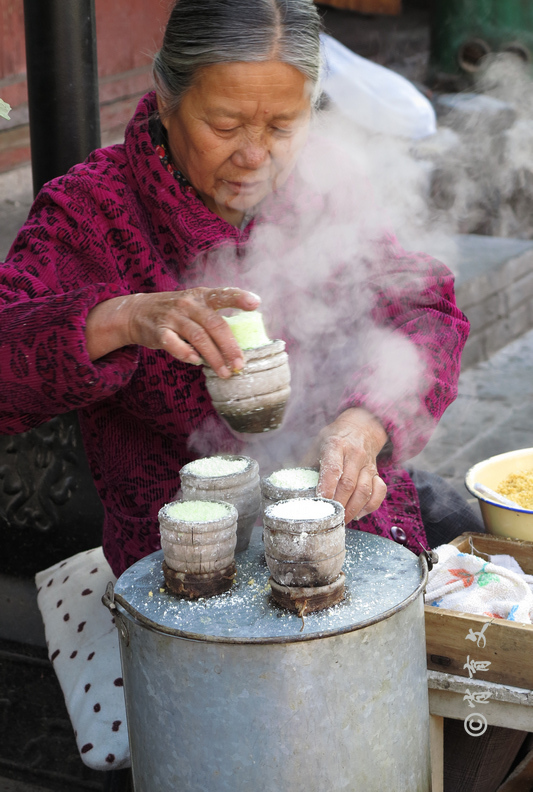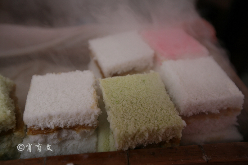 青豆小糕是到巍山的第二天早晨才吃到的。青豆小糕蓬松绵滑,散发着青豆隐约的芳甜。如今的小糕摊上还多了各种色泽的小糕,洁白的大米糕,金黄的玉米糕,褐红的高粱米糕,应季的青豆小糕,一合合色香味形样样俱全的小甄糕,成为古城小吃里一道精美温润的风景。