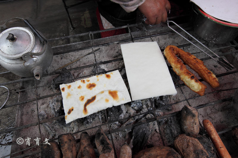 把薄薄的饵块放到炭火上烤,里面夹的空气受热膨胀,不一会儿工夫表皮微焦的饵块鼓起来,抹上调料卷起来就可以吃了,可真是让人欲罢不能。