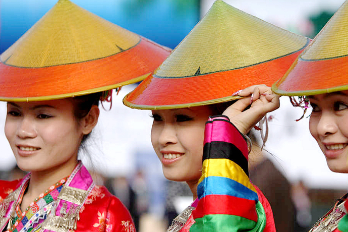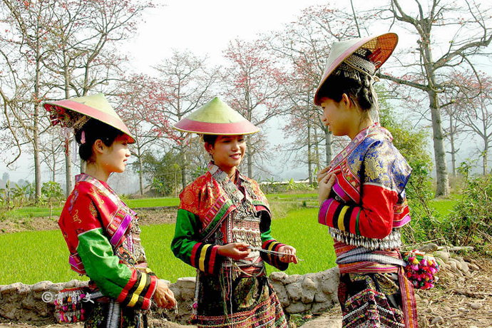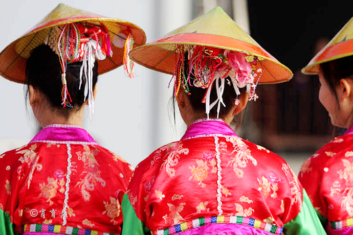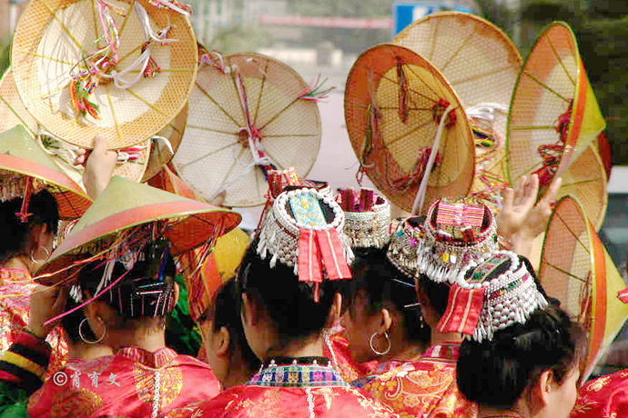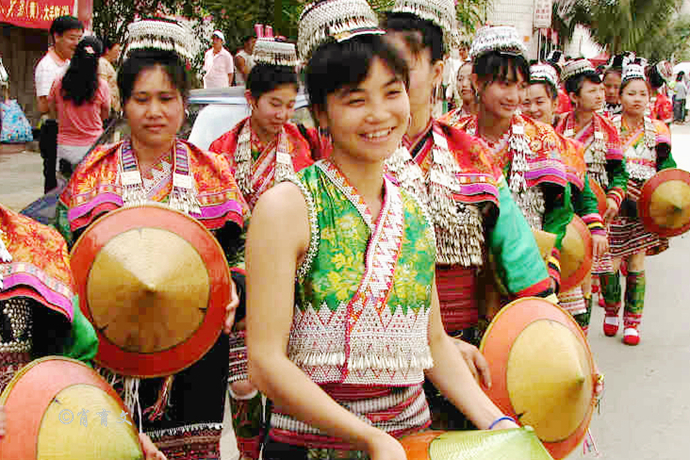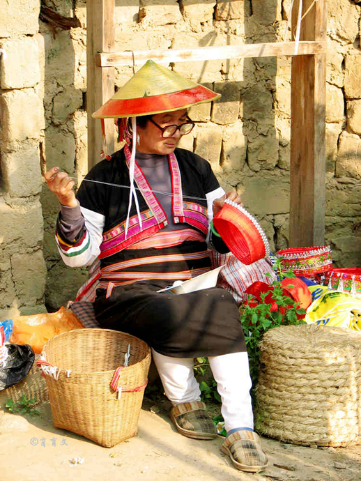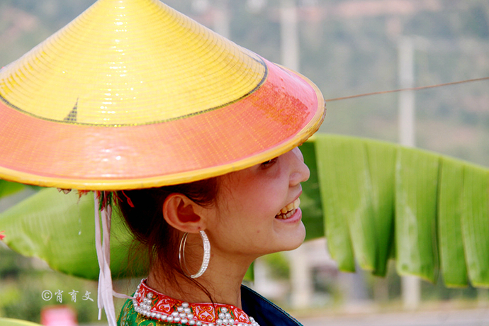 “花腰傣之乡”的招牌很显眼,时常有头戴小斗笠的傣家女子迎面走来,斗笠几乎遮住了她们的半张脸。一张俊俏的脸,便半羞半闭地隐藏在鲜艳夺目的红花竹银当中。