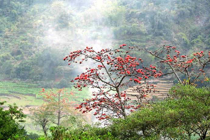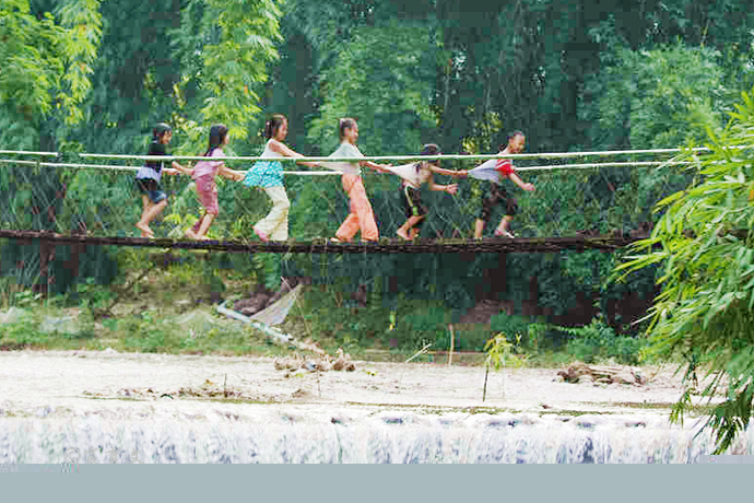 漩涡河在村南与戛洒江汇合,如一个孩子奔入母亲的怀抱。一座钢绳和竹子铺就的吊桥架在漩涡河上,当地人叫它情人桥。过了情人桥,又是古树林,那是花腰傣青年男女对歌的地方。