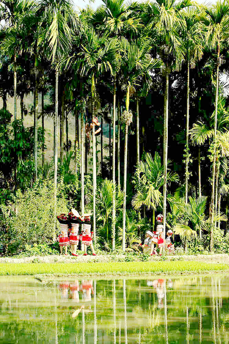 大槟榔园村名实相符,进村的路边栽满了槟榔树。风从红河上游的戛洒江边吹来,带着凉意,槟榔树叶沙沙作响。居住在这里的傣族叫“傣洒”(花腰傣分为傣洒、傣雅、傣卡),常年嚼槟榔。