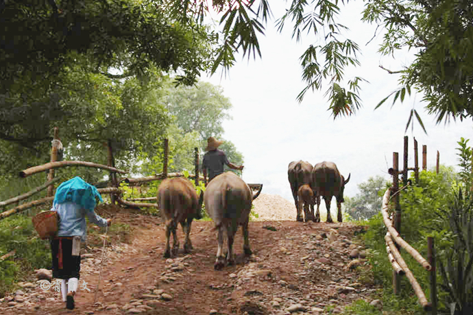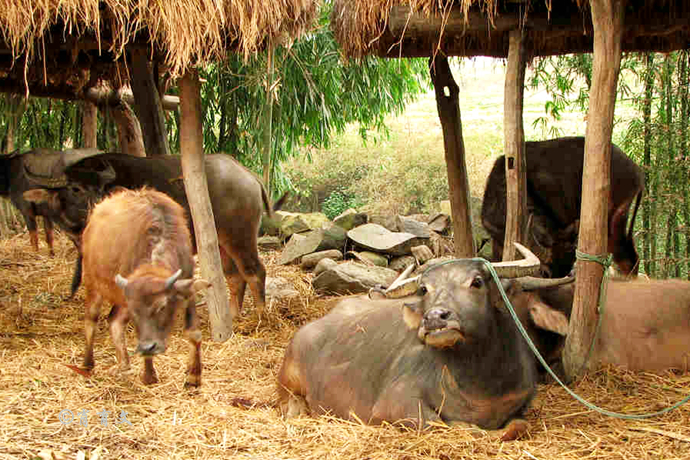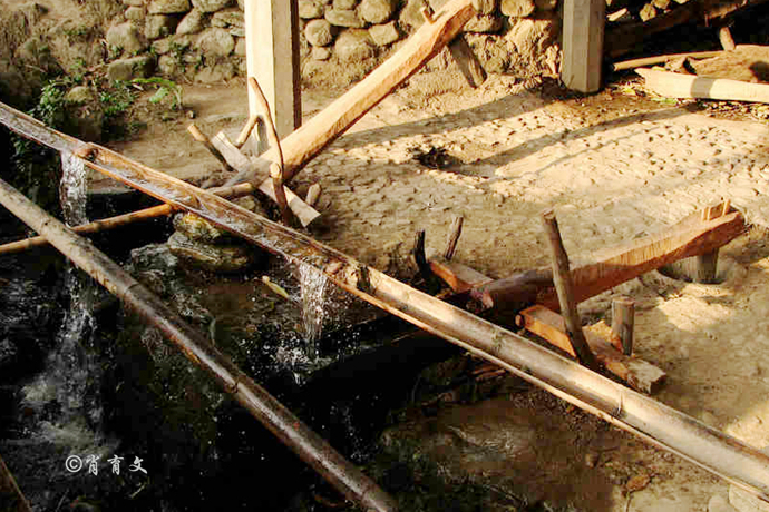 走进水系列生产地,这里已经没有了想象中的“咣咚隆”的舂碓声,也没有了水锯的欢鸣声,有的只是淙淙流水下,静穆的石头生产工具。这里已经失去了往日的喧闹,小茅棚下,只有几头水牛在懒洋洋地嚼草。