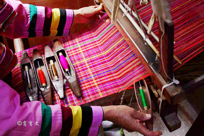 中午的村庄很安静,男人们出去干活了,女人们神情悠闲地坐在土掌房下,织布或刺绣。在这里,每家都有一架织布机。拿着木制刀枪的小孩,见惯了生人,视若无睹地在巷道里“追杀”;老人们默默地坐着,专注地享受这些宁静悠闲的午后时光。