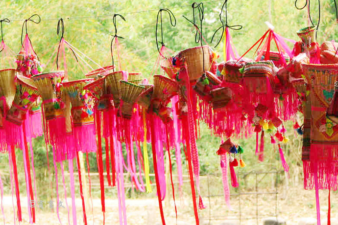 穿戴完毕,阿妈将女儿的花腰带、花筒帕、花手巾、香荷包等绣物放进缀满彩色缨绶的秧箩里,挎在女儿腰间,最后再给姑娘戴上斗笠。姑娘们便心花怒放地从家里出来,三五成群地走向“花街”。她们会各自找一块醒目的地方,从花秧箩中把心爱的绣物拿出来摆好,以等待傣家男孩来逛街串寨。