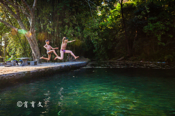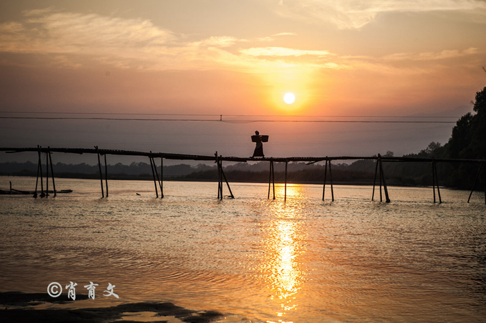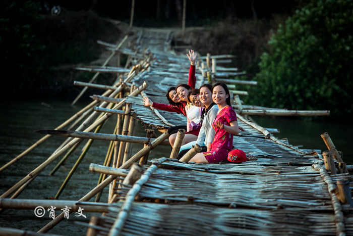 当地人在大盈江上修建了不少的竹桥,进城赶街孩子上学,既能行人又可以摩托车通行。竹桥上没有行人感觉照片少了生气,在傍晚大家又来到竹桥旁,早早地把设备支好。一位傣族老人肩挑着竹篓从竹桥上走过,快门声咔咔咔地响个不停。