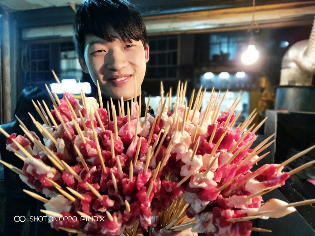 和朋友在深夜吃烧烤时,见到烤肉的帅哥拿的羊肉像一束盛开的鲜花,用OPPO Find X的人像拍照模式拍出一张很有味道肖像照。