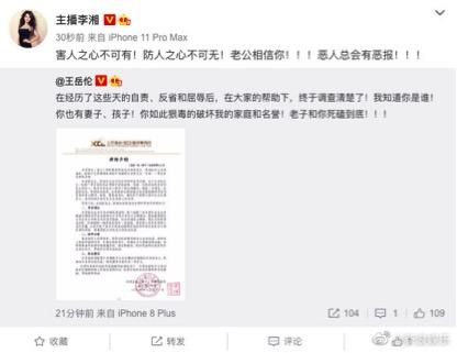 就在31日,风波之后的王岳伦发文“在经历了这些天的自责、反省和屈辱后,在大家的帮助下,终于调查清楚了!我知道你是谁!你也有妻子、孩子!你如此狠毒的破坏我的家庭和名誉!老子和你死磕到底!”随后主播李湘转发力挺老公,“害人之心不可有!防人之心不可无!老公相信你!恶人总会有恶报!”这一场闹剧也因一纸律师函,使得真相水落石出。