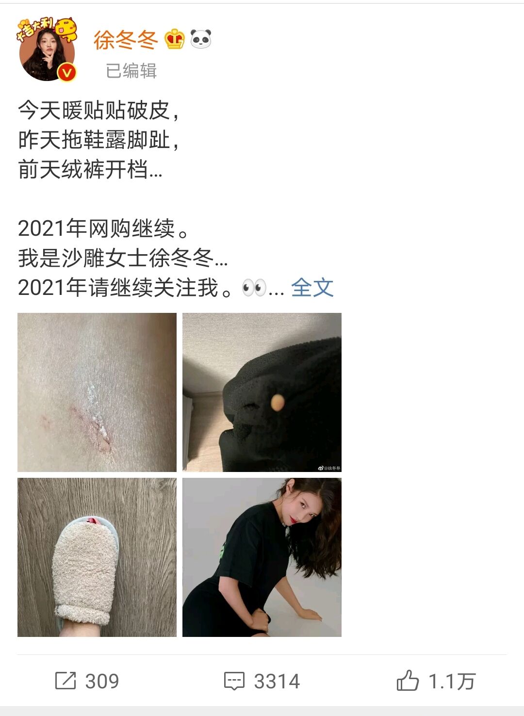 隔日,俏皮的徐冬冬再次“变本加厉”给这个搞笑故事来了个更搞笑的续篇——“今天暖贴贴破皮,昨天拖鞋露脚趾,前天绒裤开档……”此语一出,立马笑倒一片。