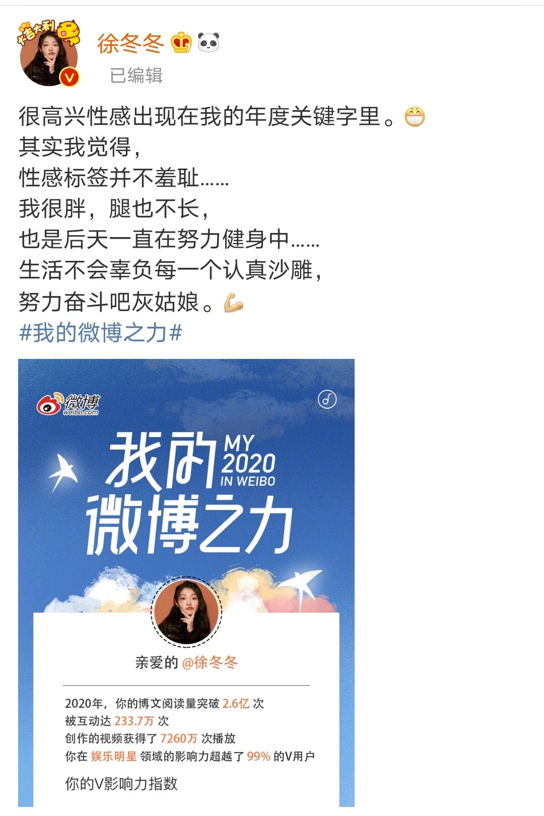 譬如有人说徐冬冬“虎背熊腰”,徐冬冬则不动声色地在自己的年度关键字“性感”中如是自嘲:“很高兴性感出现在我的年度关键字里。其实我觉得,性感标签并不羞耻,我很胖,腿也不长,也是后天一直在努力健身中,生活不会辜负每一个认真沙雕,努力奋斗吧灰姑娘。”看,这样的回复是不是很励志?!