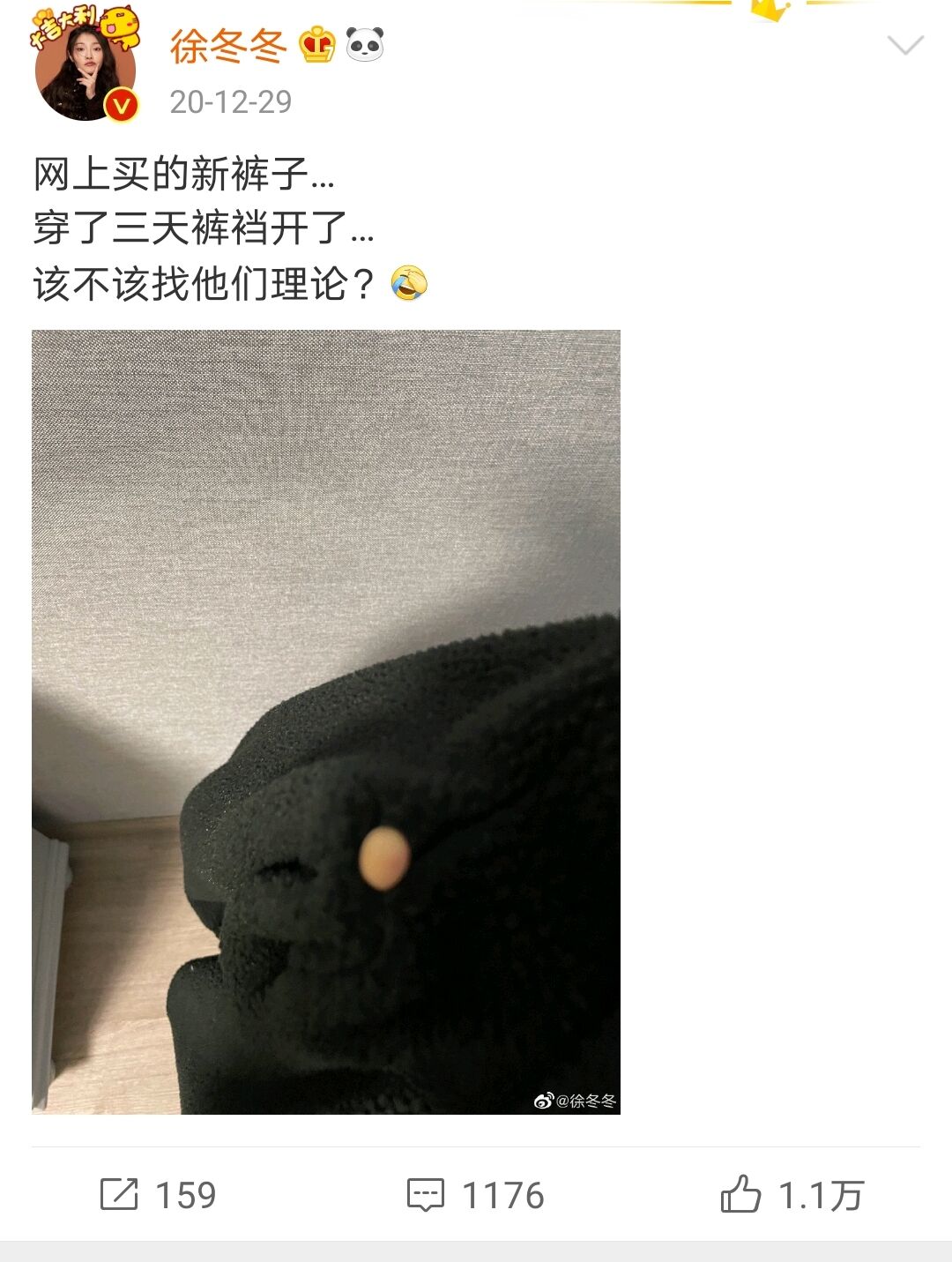 前段时间,“大嫂”徐冬冬微博上刊发了一张裤子开裂的图片,配文中笑称:“网上买的新裤子,穿了三天裤裆开了,该不该找他们理论?”看罢这则声明,捧腹大笑——这个精灵古怪的小姐姐太有趣了!