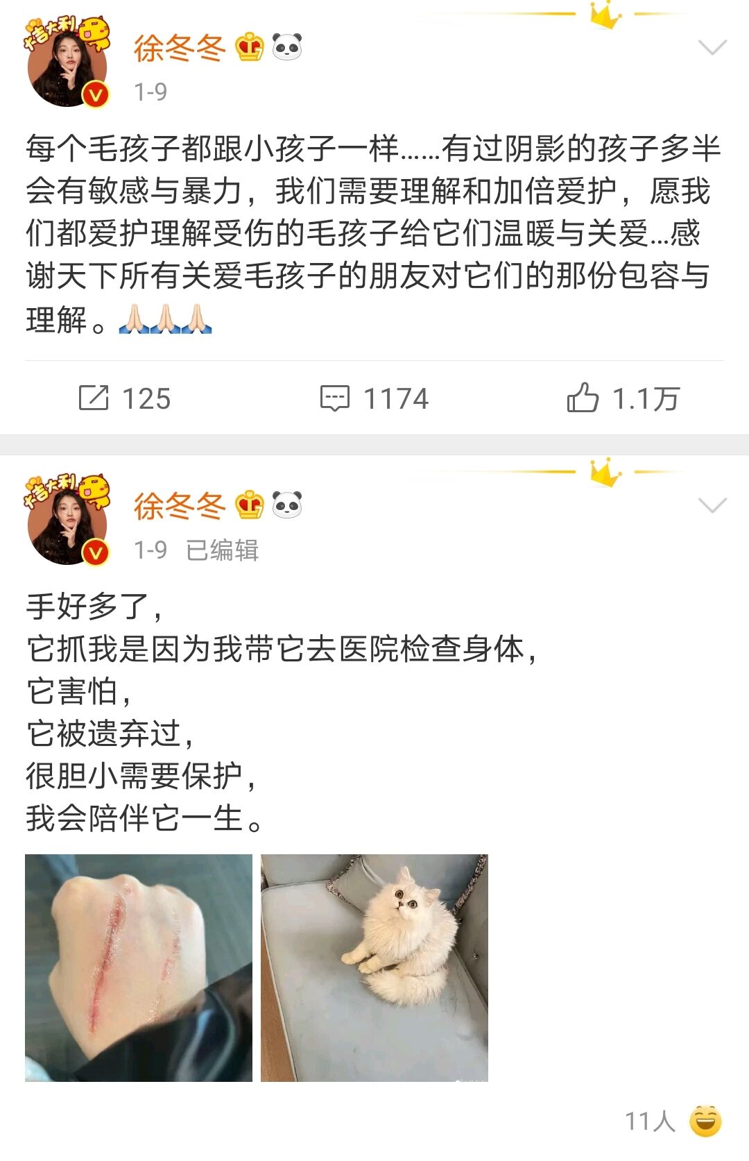 而就是这个信誓旦旦声称“爱二哈”的沙雕,却爱心满满地收养了一只被遗弃的流浪猫,甚至被猫抓伤。“它抓我是因为我带它去医院检查身体,它害怕,它被遗弃过,很胆小需要保护,我会陪伴它一生。”看来,这个精灵古怪如喵的女孩爱心满满,内心也有一片温柔的天空。
