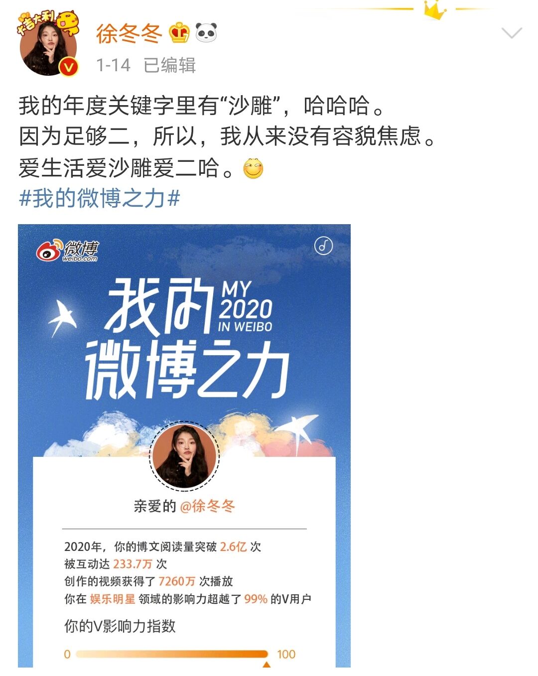 似乎,“沙雕”徐冬冬从未为自己的容貌焦虑过。而其在自己的年度关键字“沙雕”中亦如是口口声称“因为足够二,所以,我从来没有容貌焦虑。爱生活爱沙雕爱二哈。”