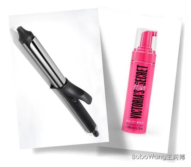 首先使用体积大约如高尔夫球大小的Victoria’s Secret Hair Mega-Lift Mousse(上图右)梳理天使们的长发,再使用GHD Curve Classic Curl Iron卷发棒(上图左)烫卷,最终待发卷冷却后用宽齿将卷发疏通再借助吹风机营造蓬松发根。