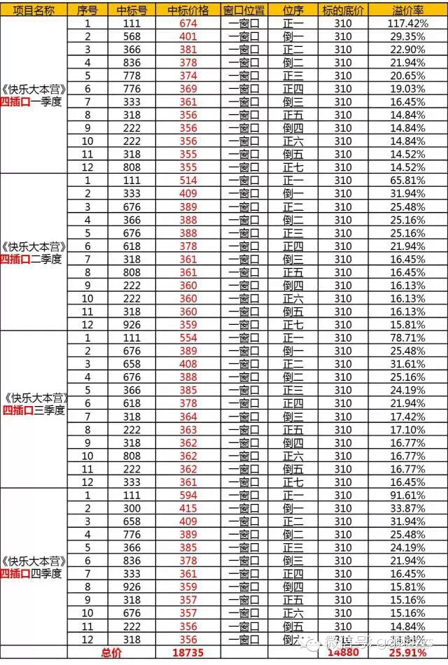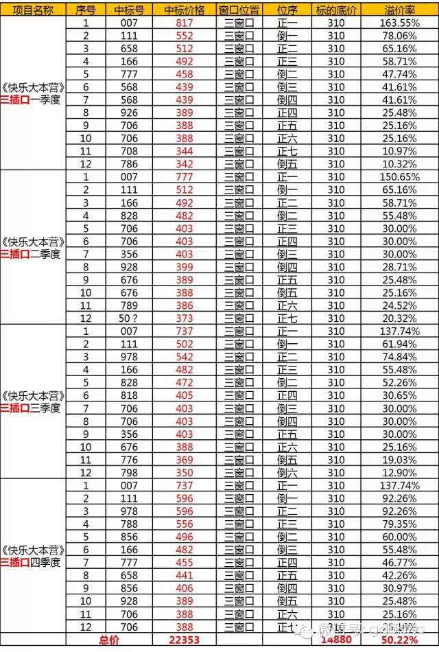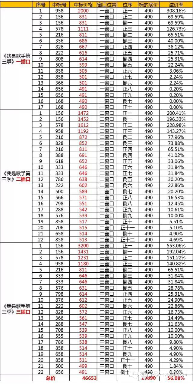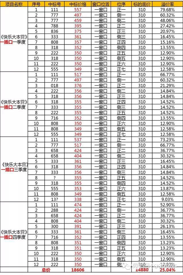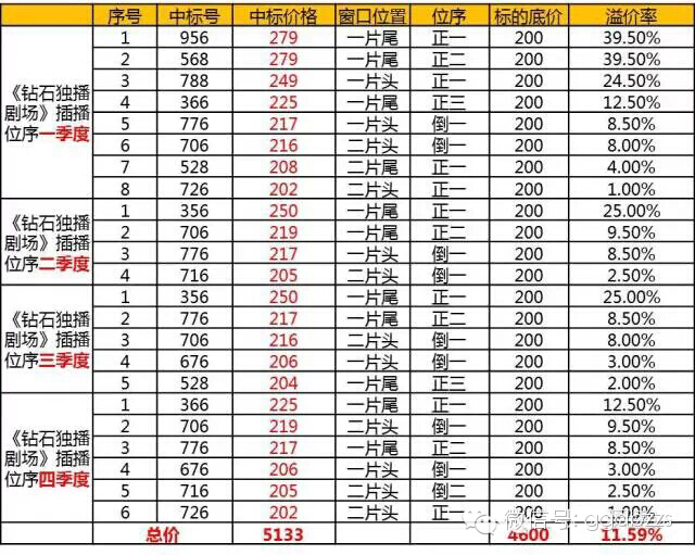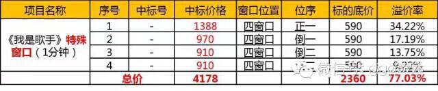 标底价310万(13期)。最高中标额: 897万元,较标底涨幅189%,每条15秒单价:69万;最低中标额:342万元,较标底涨幅10%,每条15秒单价26.3万。