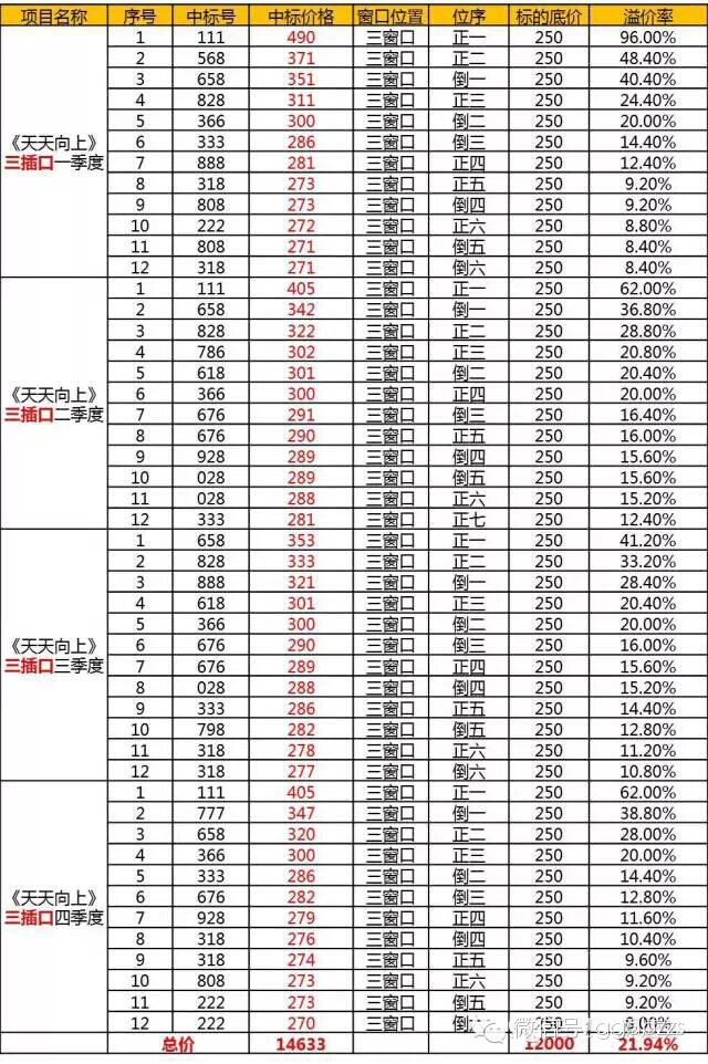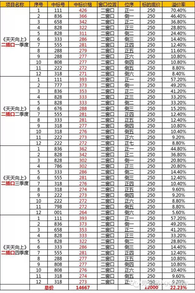 标底价590万(14期)。最高中标额1388万元,较标底涨幅135%,每条15秒单价99.14 万元;最低中标额910万元,较标底涨幅54%,每条15秒单价65万元。