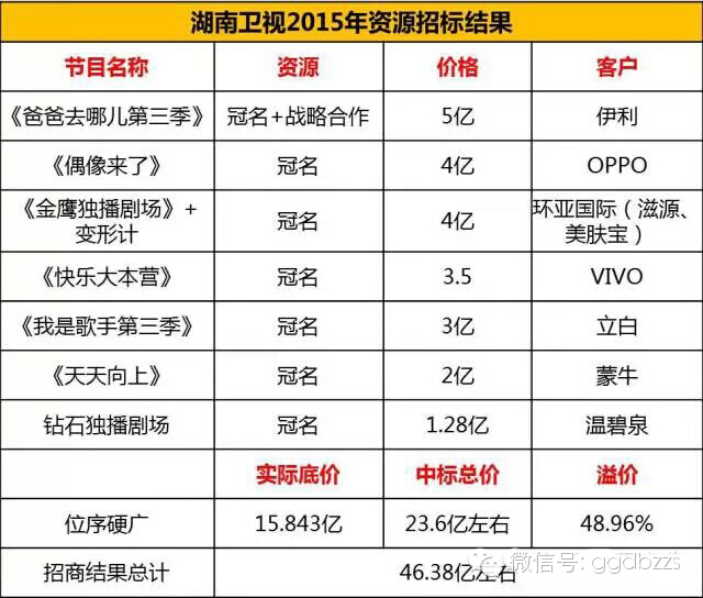 湖南卫视当天拿出的明年部分黄金广告资源主要包括《我是歌手》第三季、《快乐大本营》、《天天向上》、《金鹰独播剧场》、《花儿与少年》第二季的插播位序广告。与往年招标会流程不同的是,今年招标现场前奏阶段就进行了三个大项目的现场冠名签约。其中立白洗衣液3亿元继续冠名《我是歌手》,VIVO3.5亿冠名《快乐大本营》,OPPO以4亿高价冠名全新季播节目《偶像来了》。