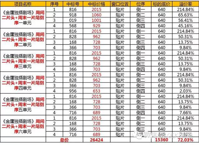 标底价640万。最高中标额: 1032万元,较标底涨幅61.3%,每条15秒单价:16.6万;最低中标额:640万元,较标底涨幅为0,每条15秒单价10.6万。