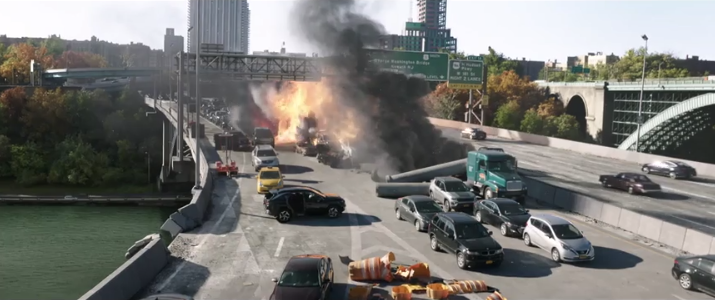 前文说过,蜘蛛侠系列的有优势之一是足够接地气,这一部的故事依然以现实城市为基础,公路车辆的连环爆炸更有代入感。