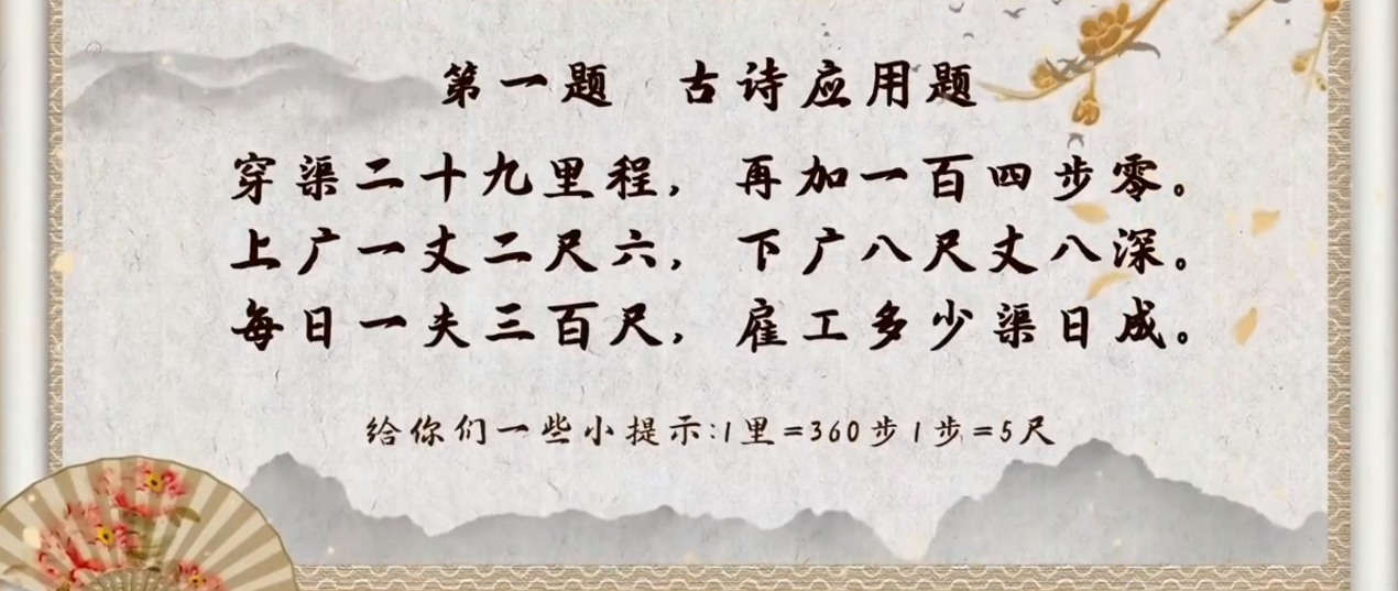 比如两队面对的第一道考验是通过计算得到密码盒的密码,题目则是古诗应用题,题中的里、步、尺、丈都不是现代常用的计量单位,少年们要通过这些数字计算雇工挖渠的时间,观众在看到这个题面时,就可以和“超脑少年”们PK一下,看看自己能不能计算出正确答案。
