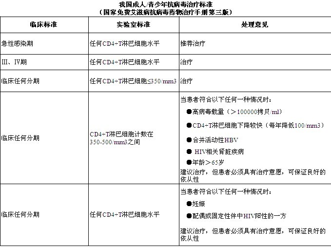 我国制定的《国家免费艾滋病抗病毒药物治疗手册第三版》对治疗标准进行了修订(见下表),其中对提前抗病毒治疗标准做了说明:“配偶或固定性伴中HIV阳性的一方,不论任何临床分期或任何CD4水平,均建议治疗。”鉴于MSM人群性行为活动特点,绝大多数MSM感染者都有固定性伴或相对固定的性伴,因此可以参照第三版手册的上述标准,开始提前抗病毒治疗。
