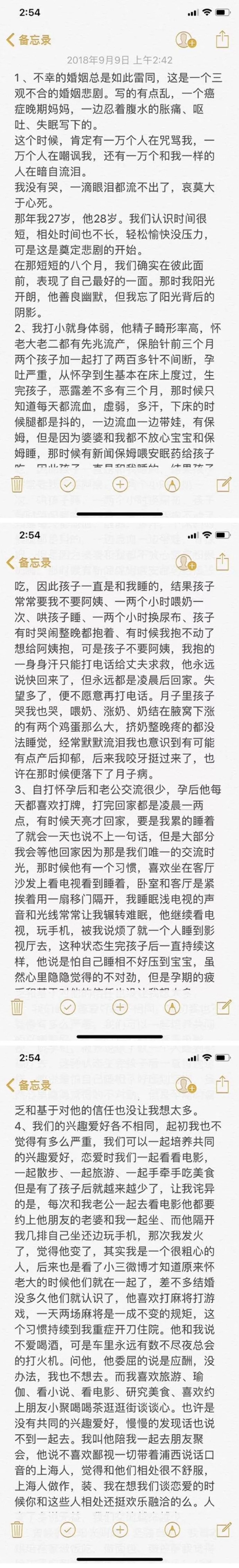 在沈丽君的遗书中可以看到,她结婚之后就努力做一个贤妻良母,为了给老公生孩子,她为了能怀孕保胎打了两百多针,吃这些苦都是自己自愿的。就是希望老公可以看到自己所付出的努力,态度会有所改观,但是没想到老公在自己怀孕期间,还是多次出轨。