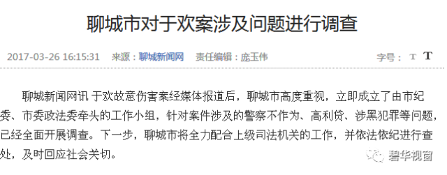 但这条简短新闻让人喷饭,消息称,“于欢故意伤害案经媒体报道后,聊城市高度重视,立即成立了由市纪委、市委政法委牵头的工作小组,针对案件涉及的警察不作为、高利贷、涉黑犯罪等问题,已经全面开展调查。”