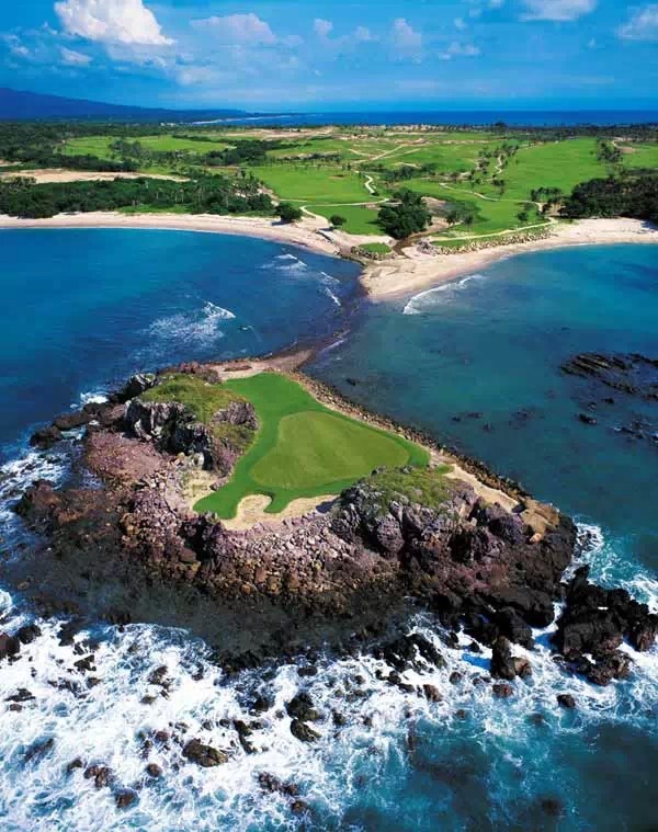 从正式比赛用发球台越过太平洋海域,直至黑色火山石小岛上,总长199码。只有在落潮时驾驶水路两栖交通工具才能登上这个小岛。
