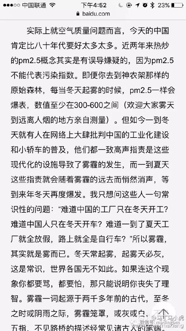 雾霾围城,小半个中国都变成了灰蒙蒙的天气。红色警报频传,多地小学放假。如若说,雾霾和PM2.5超标真如这篇狗屁倒灶的文章里所说的,根本是群众杞人忧天,对人没有太大的伤害。那么各地政府的红色预警,相关部门的努力整治,中央政府对新能源的开发等等诸多政策,就也变成了无厘头的行为。不知道本想昧着良心力证雾霾无害的作者,有没有考虑过自己站到了政府的对立面上?这篇文章似乎是在对相关部门的紧张给予嘲讽,肆意的说你们这么紧张太过无知?