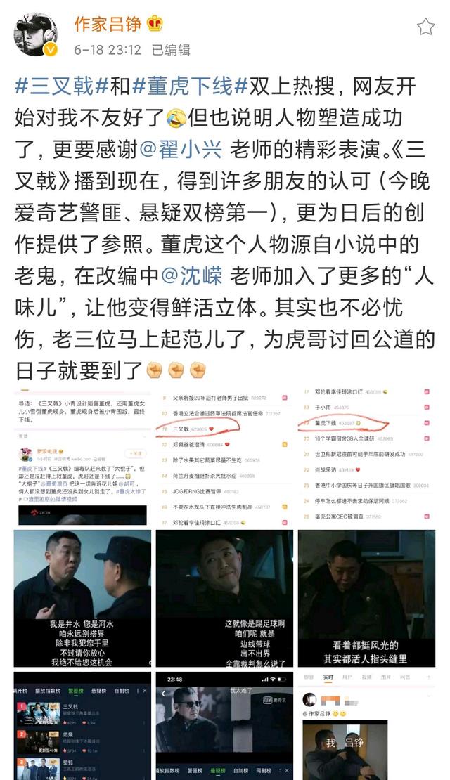 刘海波执导,陈建斌、董勇、郝平领衔主演,何杜娟、徐绍瑛、胡可、王骁、巫刚、翟小兴、丁勇岱主演,陶红、赵子琪、侯岩松特别出演的电视剧《三叉戟》正在浙江、江苏两大卫视热播,在最新播出的剧情中,一直东躲西藏的董虎为了救女儿小雪,赴小青的仓库之约,可叹做了半辈子混世魔王,最终横尸街头,领盒饭方式感人唏嘘。