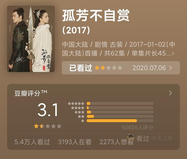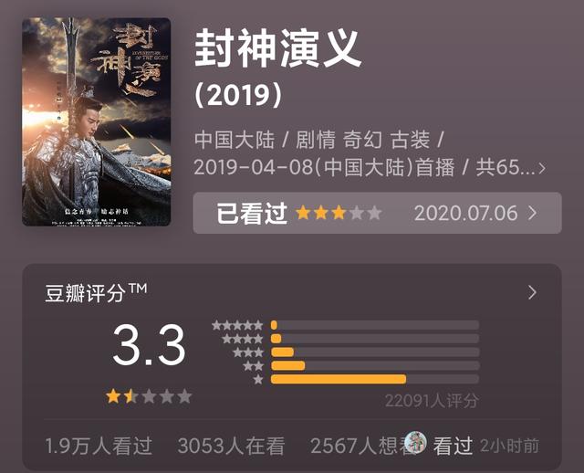 在电视剧里面,这是一个不多见的低分,在小编的记忆里,这几年只有《孤芳不知赏》和《封神演义》是出了名的低分。