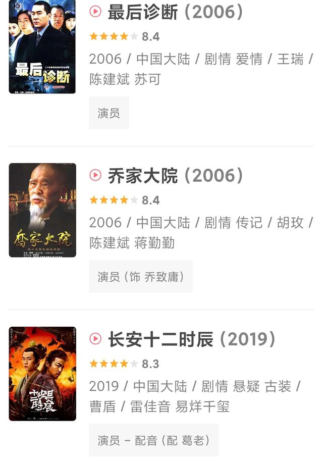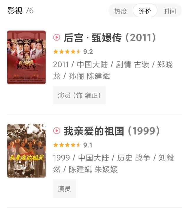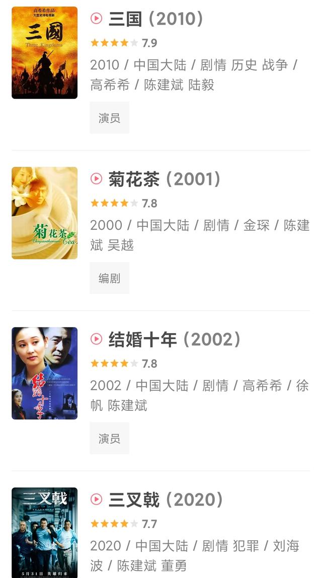 陈建斌一直是荧屏上的品质保证,出道二十多年出演的很多电视剧如《乔家大院》《刑警使命》《长安十二时辰》《三国》都是在8分以上,还有《甄嬛传》这样的9分神作。
