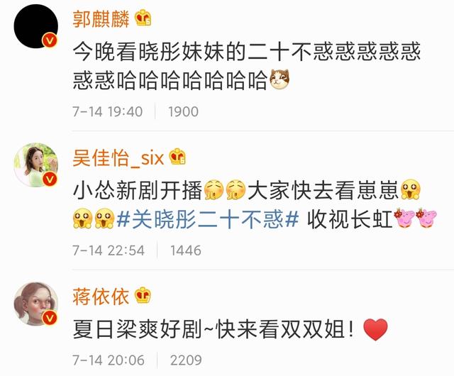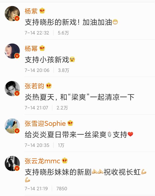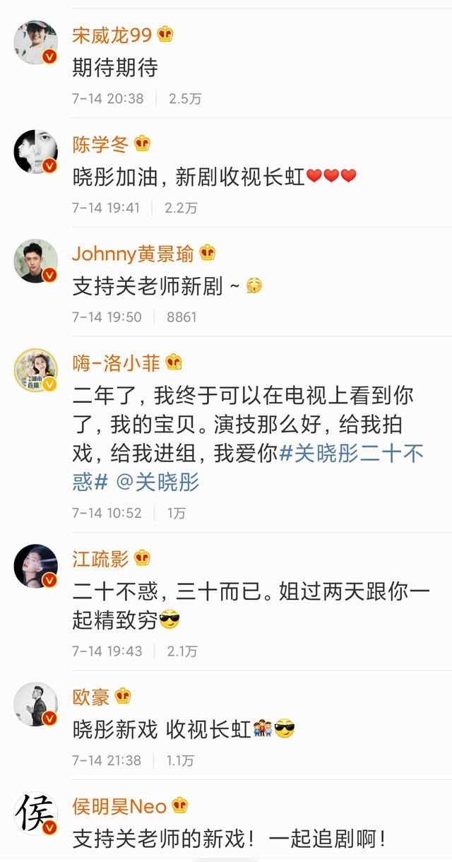 杨紫、杨幂、孙俪、张若昀、张云龙、张雪迎、宋威龙、黄景瑜、陈学冬、江疏影、郭麒麟、欧阳娜娜、贾玲等诸多明星组成的豪华亲友团都第一时间发文为关晓彤的新剧助威。