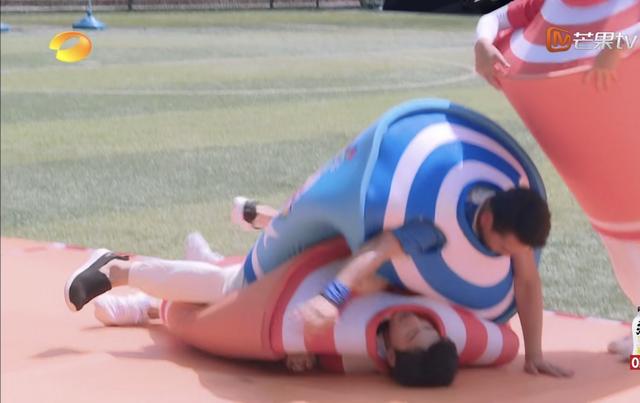 比赛中弟弟们经常被哥哥们压在下面,在一次争夺中,杨洋摔倒的地方再偏一点点就会撞到头了。