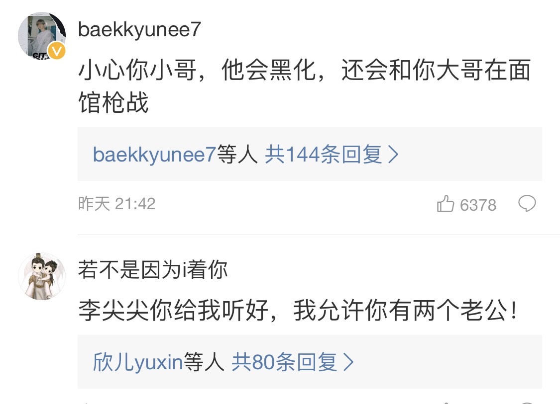 网友在该投稿下面评论道:“李尖尖你给我听好,我允许你有两个老公”!