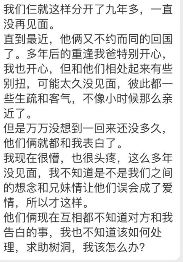 而这个树洞博主还曾经收到过一篇投稿叫《两个青梅竹马一起长大的哥哥,都和我表白了,怎么办》。