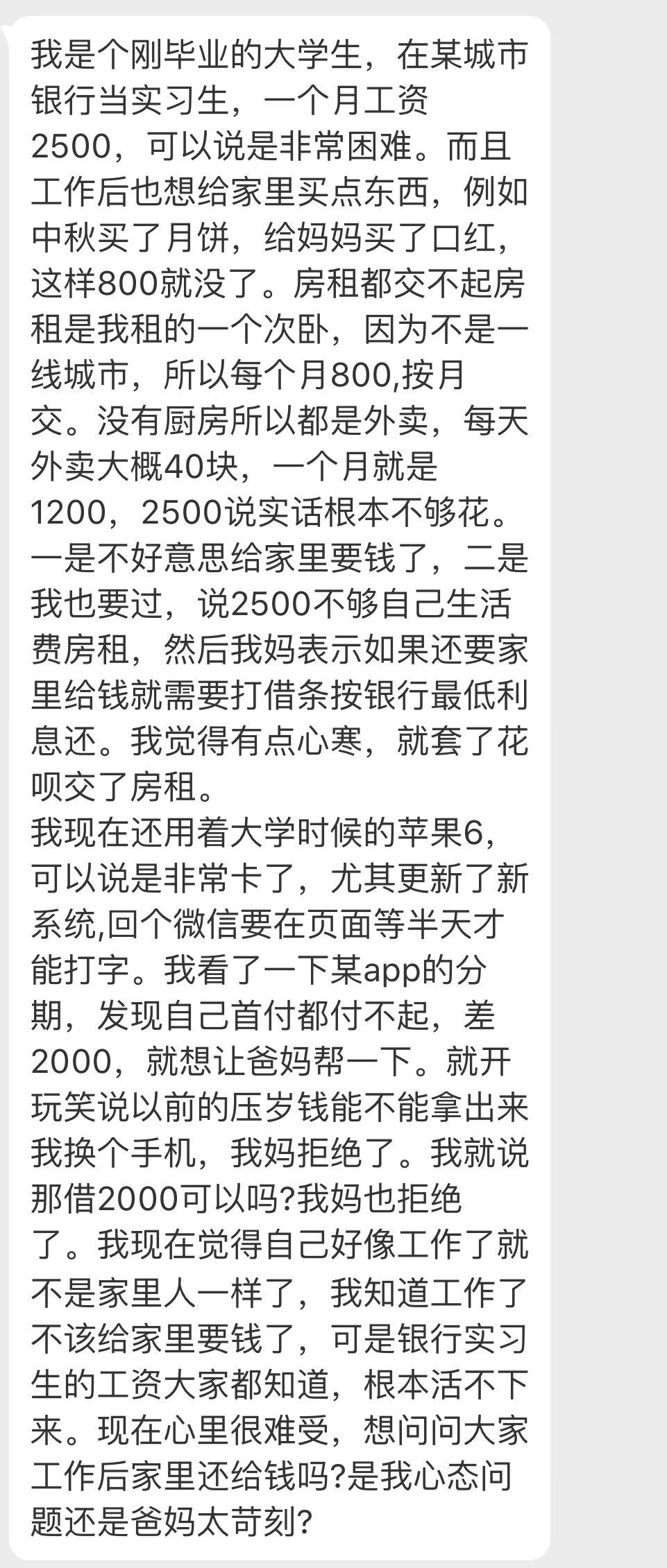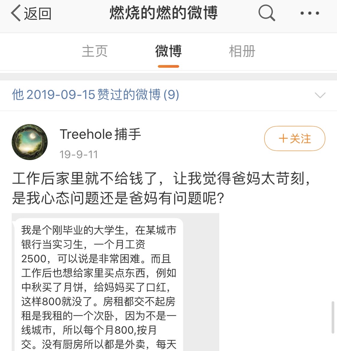 该微博曾点赞一个厦门本地的树洞投稿,投稿中的主人公说自己在银行实习,月薪2500,房租都交不起,想跟父母要钱维持生活。