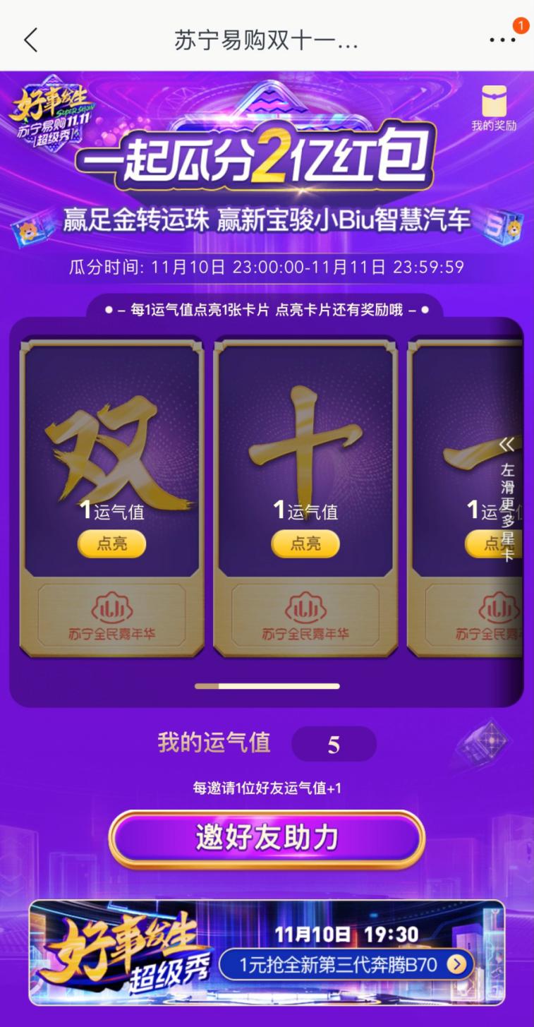 11月10日晚,苏宁超级秀除了超豪华的明星阵容值得期待以外,福利环节同样非常引人关注。提前打卡苏宁易购APP、邀请好友集齐"双十一好事发生"7张卡片,就可以在超级秀当晚11点瓜分2亿红包,同时还可以获得抽小Biu汽车、足金转运珠大奖的机会,福利到手简直轻而易举。