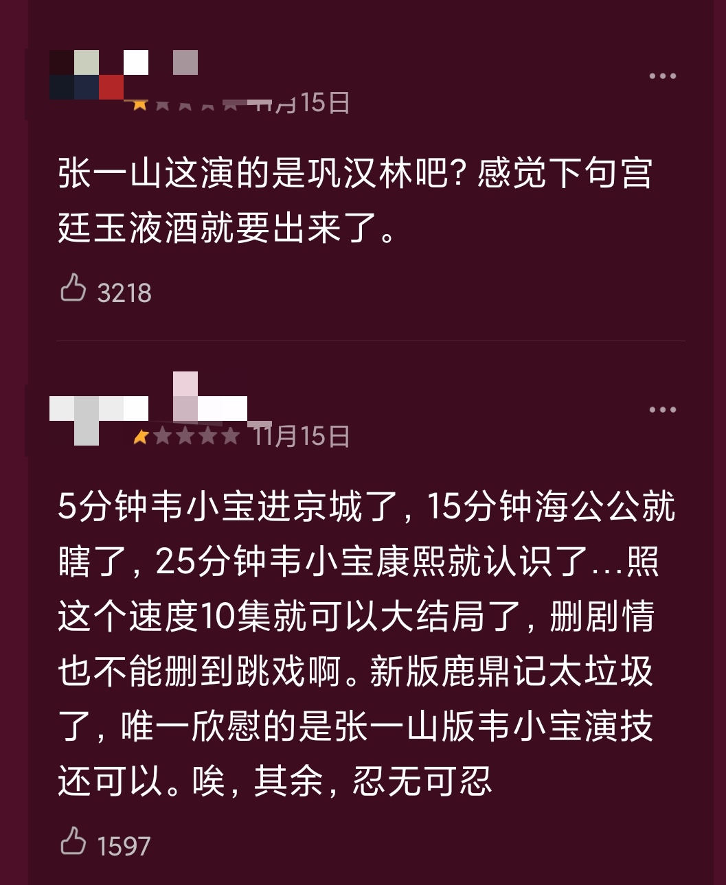 张一山版韦小宝浮夸难看,新版《鹿鼎记》也确实不好看,别说比陈小春版,就连黄晓明版也比这个好看多了。烂剧被批被骂都是正常的,可是在正常的批评和吐槽声中,有一点却很不正常,那就是几乎所有的矛头都对准了张一山。