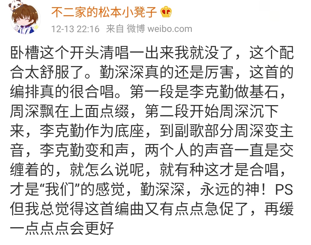 勤深深这次返场,演唱的就是网友投票选出的歌曲《富士山下》,两个人久别重逢,配合丝毫不见生疏,反而更加默契,一开口的清唱就炫音绕梁,声音层层叠叠,此消彼长,像一对恋人互诉衷肠,又像一对兄弟情深意长,李的温暖,周的清凉,结合在一起像艺术品一样,能给人带来无尽遐想。