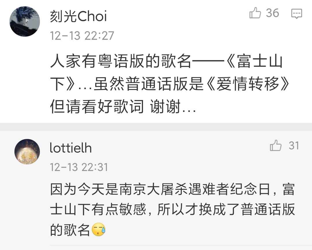 可能有些观众会感到奇怪,为什么这首歌明明是《富士山上》,为什么主持人说的和字幕配的都是《爱情转移》。其实原因很简单,因为节目播出这天,是一个特别的日子,为了不引起观众的反感和不必要的联想,不太适合出现歌名中的这座山或相似的元素,所以把用普通话版歌名替代。