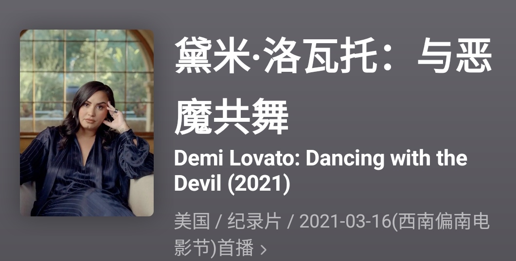 如今已经摆脱魔鬼,痛定思痛的黛米终于决定公开这一切,在个人成长纪录片《与魔鬼共舞》里面,她将首度对外讲述了自己与毒瘾作战的艰难历程。就像制片人珍妮·皮尔森所说“看到她如此毫无伪装地讲述自己的故事,真的令人难忘。”