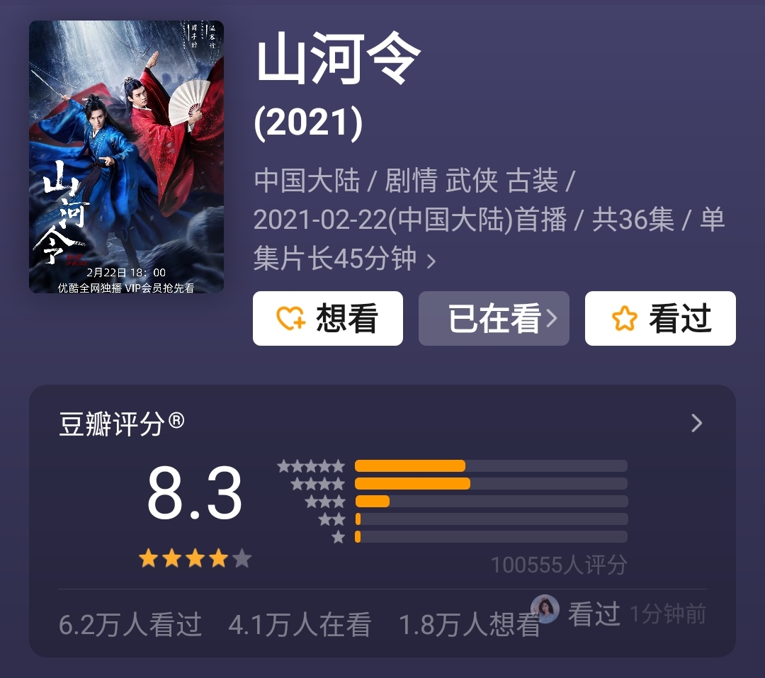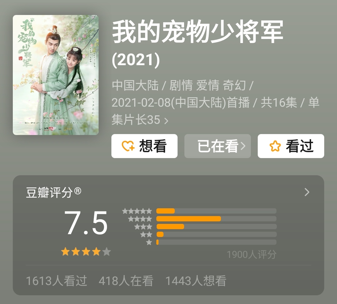 估计很多喜欢甜宠剧的朋友都已经在追这两部剧了,没错,一部是豆瓣8.3分的《山河令》(优酷),另一部是7.5分的《我的宠物少将军》(搜狐),都是高分好剧,追不了吃亏追不了上当,连电视费都不用交就随时追起来的好剧,追起来太香了。