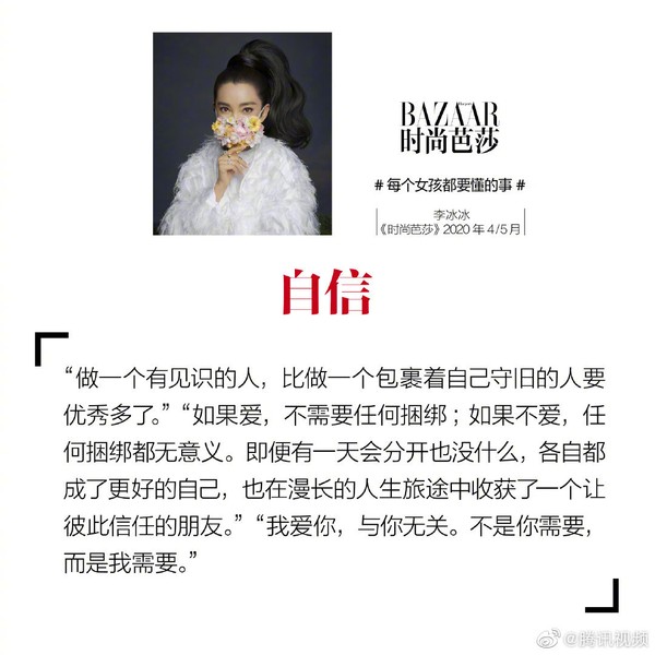 李冰冰曾说不同的年龄的女人有不同的魅力,人生给了你太多需要时间才能获得的体会,这种东西真的是财富。这一段感情的结束也带给了李冰冰新的成长,舆论的攻击会动摇用爱筑成的城池营垒,而当下的体验和感受往往更为重要,这些体验和感受在未来就变成了难得的人生财富。